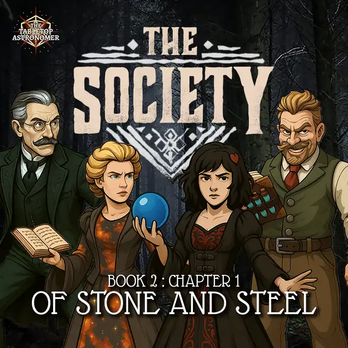 The Society gathered their belongings and stepped out into the night. The woods stretched before them, dark and dense, their lanterns casting flickering pools of light that barely held back the encroaching shadows. The ground was rough and uneven, with tree roots twisting underfoot. The deeper they moved into the trees, the quieter the world seemed to become, the distant sounds of nocturnal creatures fading into a watchful silence.