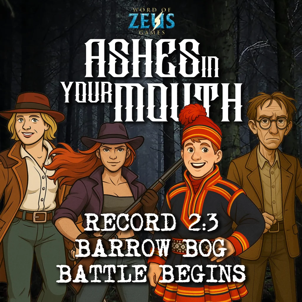 While we were attempting something vaguely resembling rest inside Hazel Fisher’s glorified moss-shed, the unmistakable sound of trouble (heavy boots, muttered threats, the faint clinking of cursed chains) drifted through the trees. Three figures: Bobby Lee Green and two familiar Barrow & Locke stooges. Each carried a chain ending in what I can only describe as mummified monkeys—Hazel called them “Shucks.” Great. Nothing like a cursed simian to start the day.